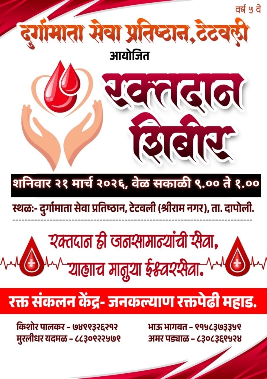 दापोली तालुक्यातील टेटवली (श्रीराम नगर) येथे दुर्गामाता सेवा प्रतिष्ठानच्या वतीने भव्य रक्तदान शिबिराचे आयोजन करण्यात आले आहे. येत्या शनिवार, २१ मार्च २०२६ रोजी सकाळी ९.०० ते दुपारी १.०० या वेळेत हे शिबिर पार पडणार असून, परिसरातील नागरिकांनी मोठ्या संख्येने सहभागी व्हावे, असे आवाहन आयोजकांकडून करण्यात आले आहे.