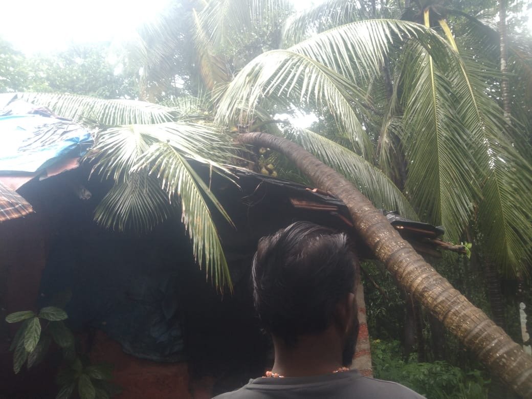 सोसाट्याच्या वा-यामुळे शंकर रेवाले यांच्या घरावर नारळाचं झाड कोसळल्याची घटना घडली. घरी कोणीही नसल्याने या दुर्घटनेत जीवितहानी अथवा जखमी कोणी झालेलं नाही मात्र शंकर रेवाले यांच्या घराचे मोठं नुकसान झाले.