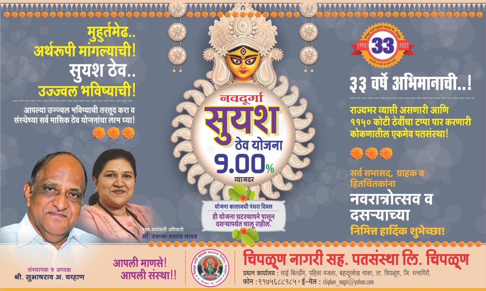 तर आता नवरात्रोत्सवनिमित्त नवदुर्गा सुयश ठेव योजना घटनस्थापनेच्या दिवशी सुरू करण्यात आली. या योजनेचा कालावधी १५ दिवसांचा असून ठेवीला ९% टक्के व्याजदर ठेवण्यात आला असून सर्वसामान्यांनी या योजनेत सहभागी व्हावे, असे आवाहन चिपळूण नागरी पतसंस्थेचे संस्थापक अध्यक्ष सुभाषराव चव्हाण व मुख्य कार्यकारी अधिकारी स्वप्ना यादव यांनी केले आहे.