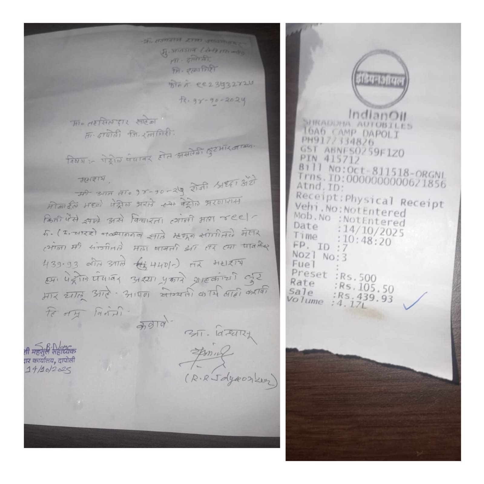 याबाबत त्यांनी तत्काळ पंपावरील अधिकाऱ्यांकडे तक्रार केली, मात्र तेथून कोणतीही दाद न मिळाल्याने अखेरीस त्यांनी दापोली तहसील कार्यालयातील पुरवठा विभागाकडे लिखित तक्रार दाखल केली आहे.