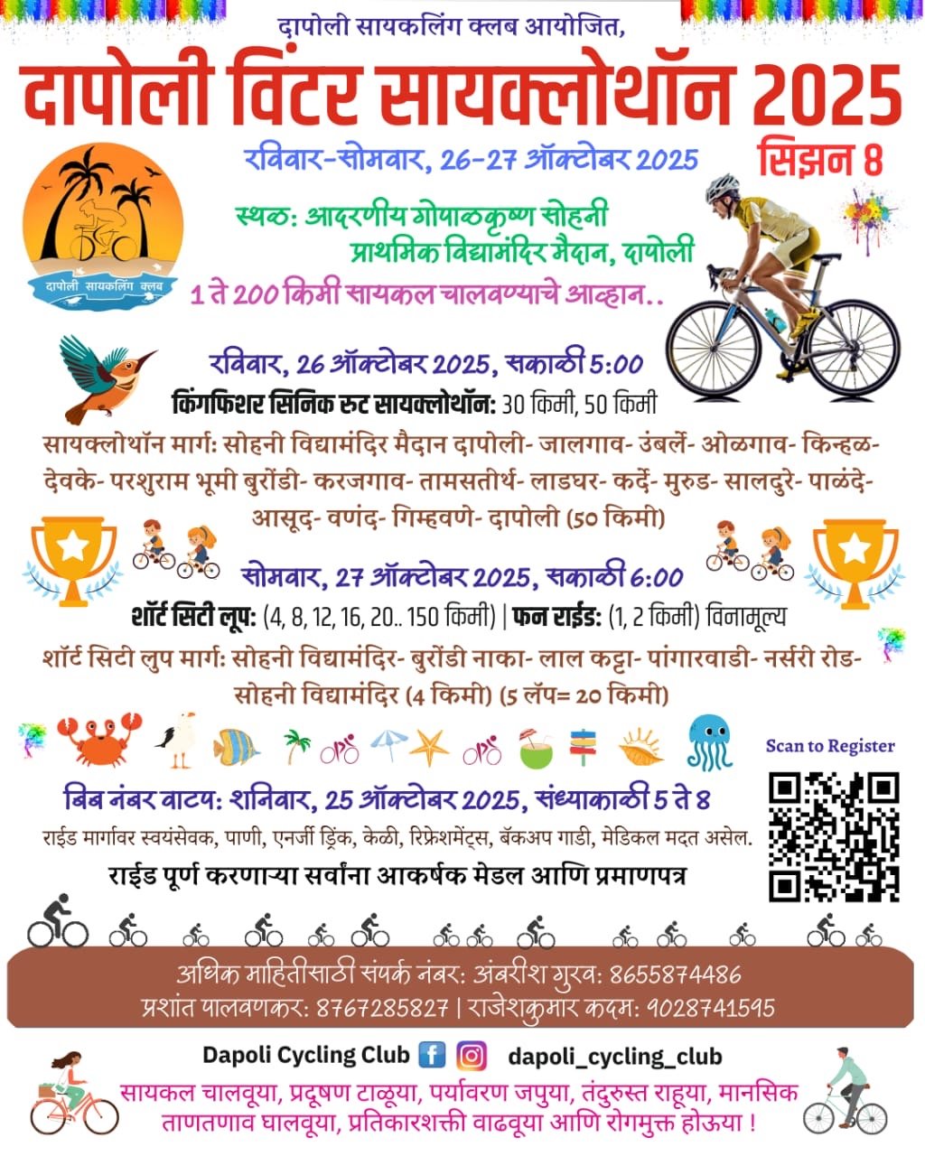 ही सायकल स्पर्धा १ ते २०० किमी अंतराची असून ५० किमी किंगफिशर सिनिक रुट, ४ ते २०० किमी शॉर्ट सिटी लूप, फन राईड अशा गटात होणार आहे. प्रत्येक स्पर्धकाला आकर्षक मेडल आणि प्रमाणपत्र देऊन गौरवण्यात येईल. शॉर्ट सिटी लूप मार्गावर ७५, १००, १२५, १५०, १७५, २०० किमी सायकल चालवणाऱ्या स्पर्धकांना प्रत्येकी ३००, ४००, ५००, ६००, ७००, ८०० रोख रक्कम बक्षिस असेल. शिवाय इतर काही खास बक्षिसे पण असतील. ५० किमी किंगफिशर सिनिक रुट सायक्लोथॉन मार्ग सोहनी विद्यामंदिर दापोली ते जालगाव, उंबर्ले, ओळगाव, किन्हळ, देवके, बुरोंडी, लाडघर, कर्दे, मुरुड, सालदुरे, पाळंदे, आसूद, दापोली असा समुद्रकिनाऱ्यावरील गावातून असेल. राईड मार्गावर स्वयंसेवक, पाणी, फळे, स्नॅक्स, बॅकअप टेम्पो, मेडिकल मदत असेल. अधिक माहितीसाठी संपर्क नंबर ८६५५८७४४८६, ८७६७२८५८२७, ९०२८७४१५९५ हे आहेत.