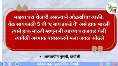 दापोलीत पुन्हा एक संतापजनक घटना घडली आहे. घटना आहे रविवार 9 फेब्रुवारी 2025 च्या संध्याकाळची साधारण 5 वाजताची ठिकाण आहे घटना घडलीय दापोलीतील खोंडा या परिसरात एका कॉलेज शेजारी. यामधील अल्पवयीन मुलगी आणि आरोपी शेजारी शेजारी राहतात.