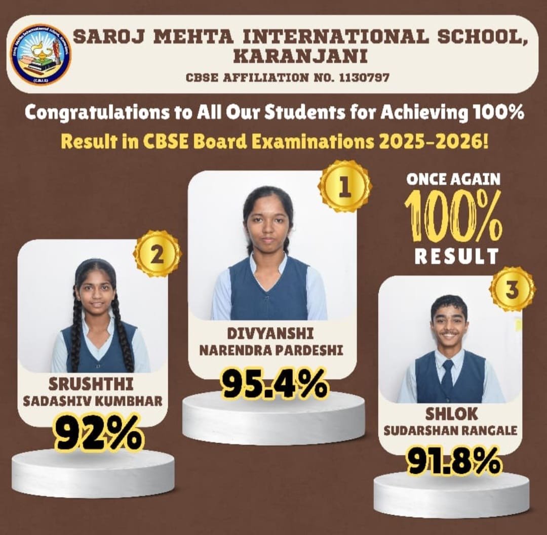 या शानदार निकालामुळे परिसरात सरोज मेहता इंटरनॅशनल स्कूलचे सर्वत्र कौतुक होत असून, गुणवत्तापूर्ण शिक्षण देणारी संस्था म्हणून शाळेने पुन्हा एकदा आपली छाप उमटवली आहे.