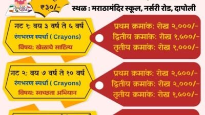 ब्रिलियंट करिअर अकॅडमी, दापोली, जेसीआय, दापोली आणि रोटरी क्लब दापोली यांच्या संयुक्त विद्यमाने तालुकास्तरीय चित्रकला आणि रंगभरण स्पर्धेचे आयोजन रविवार, दिनांक १६ फेब्रुवारी २०२५ रोजी सकाळी ७.३० वाजता शहरातील मराठा मंदिर शाळेच्या मैदानामध्ये आयोजित करण्यात आले आहे.