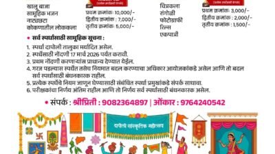दि. २२ मार्च रोजी दिवसभर चित्रकला आणि रांगोळीचे आकर्षक प्रदर्शन आयोजित करण्यात आले आहे. यामध्ये स्थानिक कलाकारांनी साकारलेल्या कलाकृतींचे प्रदर्शन पाहण्याची संधी रसिकांना मिळणार आहे. त्याच दिवशी सायंकाळी “सूर तेच छेडिता” हा विशेष संगीत कार्यक्रम सादर करण्यात येणार आहे. या कार्यक्रमात सुप्रसिद्ध गायिका मधुरा कुंभार, ऋषिकेश रानडे, सुप्रसिद्ध ढोलकीवादक निलेश परब, तसेच आर्चिस लेले आणि कमलेश भडकमकर यांच्या संचाचा सुरेल कार्यक्रम होणार असून संगीतप्रेमींसाठी हा कार्यक्रम विशेष आकर्षण ठरणार आहे.