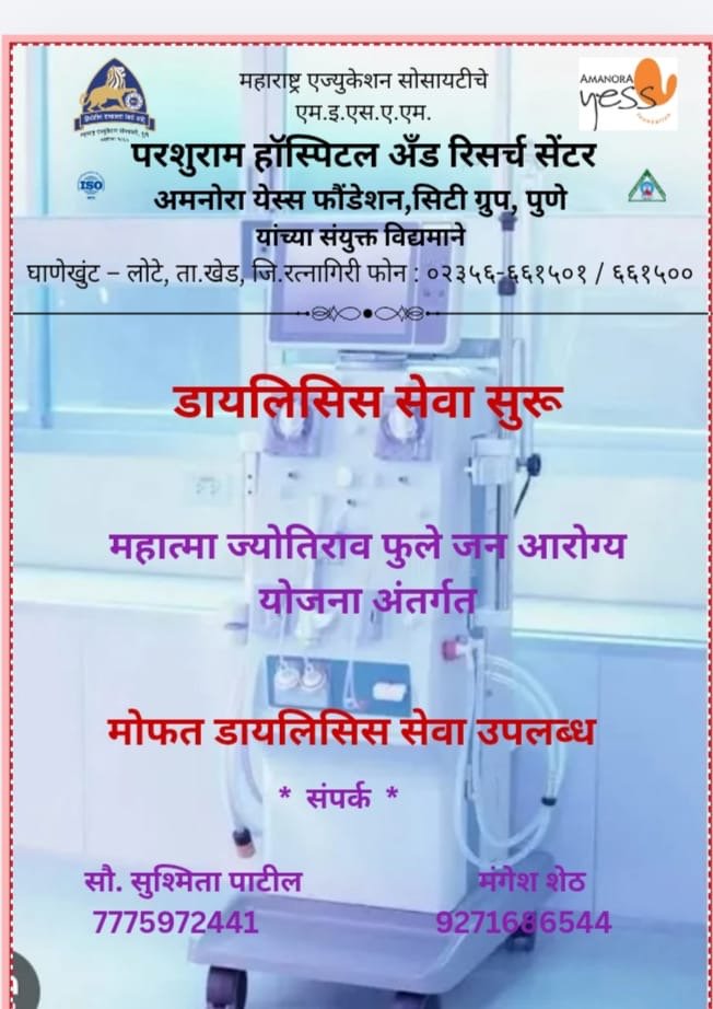 खेड तालुक्यातील घाणेखुंट–लोटे येथे महाराष्ट्र एज्युकेशन सोसायटीच्या एम.इ.एस.ए.एम. परशुराम हॉस्पिटल अँड रिसर्च सेंटर येथे डायलिसिस सेवेचा शुभारंभ करण्यात आला आहे. अमनोरा येस फाउंडेशन, सिटी ग्रुप, पुणे यांच्या संयुक्त विद्यमाने ही सेवा सुरू करण्यात आली असून, परिसरातील किडनी आजारग्रस्त रुग्णांसाठी ही सुविधा मोठा दिलासा ठरणार आहे.