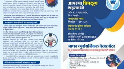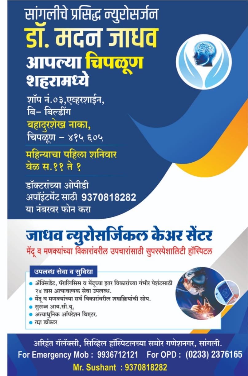 मेंदू व मणक्यांच्या विकारांबाबत जागरूकता वाढविण्यासाठी आणि रुग्णांना तज्ज्ञ उपचार उपलब्ध करून देण्यासाठी सांगली येथील प्रसिद्ध न्युरोसर्जन डॉ. मदन जाधव दर महिन्याच्या पहिल्या शनिवारी चिपळूण येथे ओपीडी घेणार आहेत. बहादुरशेख नाका येथील एव्हरशाईन बी-बिल्डिंगमधील शॉप नं. ०३ येथे सकाळी ११ ते दुपारी १ या वेळेत रुग्णांची तपासणी व मार्गदर्शन करण्यात येणार आहे.