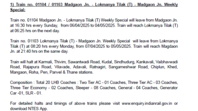 कोकण रेल्वेमार्गावर 3 एप्रिलपासून विशेष गाड्या