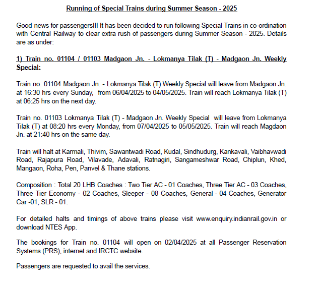 कोकण रेल्वेकडून मिळालेल्या माहितीनुसार, मुंबई-सीएसएमटी-करमळी विशेष (साप्ताहिक) ही गाडी १० एप्रिल ते ५ जूनदरम्यान दर गुरूवारी मुंबई सीएसएमटीहून रात्री १२ वा.२० मिनिटांनी सुटेल. ती त्याच दिवशी दुपारी दीड वाजता गोव्यात करमळीला पोहोचेल.