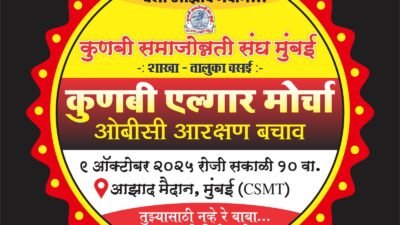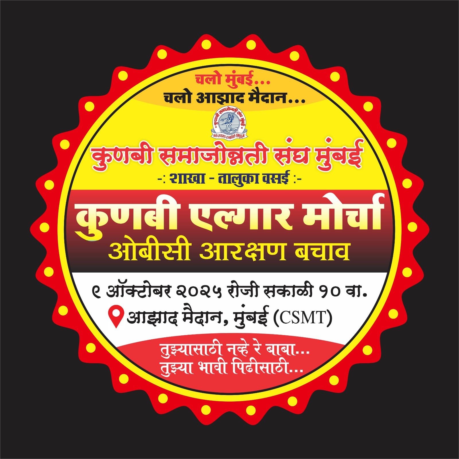 ओबीसी आरक्षणाच्या संरक्षणासाठी आणि कुणबी समाजाच्या हक्कासाठी “कुणबी एल्गार मोर्चा” काढण्यात येणार आहे. या मोर्च्याचे आयोजन कुणबी समाजोन्नती संघ, मुंबई यांच्या वतीने करण्यात आले असून तालुका वसई शाखेचा सक्रिय सहभाग राहणार आहे.