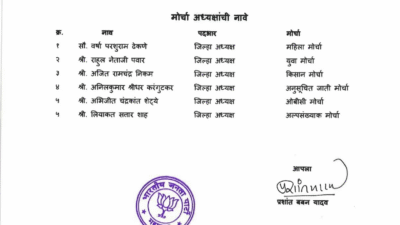 शिल्पाताई मराठे, सचिन श्रीकांत वहाळकर (रत्नागिरी), दीपक पटवर्धन (रत्नागिरी), दत्ता देसाई (रत्नागिरी), शिल्पा पटवर्धन (रत्नागिरी), अॅड. विलास पाटणे (रत्नागिरी), अॅड. बाबासाहेब परुळेकर (रत्नागिरी), मुन्नाशेठ सुर्वे (रत्नागिरी), प्रा. दत्तात्रय ऊर्फ नाना शिंदे (रत्नागिरी), सतीश मधुसूदन शेवडे (रत्नागिरी), सौ. स्वप्ना प्रशांत यादव (चिपळूण), प्रणाली अभिजित सावर्डेकर (चिपळूण), रामदार जिवाजी राणे (चिपळूण), मंगेश ऊर्फ बाबू श्रीकृष्ण तांबे (चिपळूण), विष्णू लक्ष्मणराव कदम (चिपळूण), निलेश आत्माराम भुरण (खेर्डी, चिपळूण), रश्मी राजेंद्र कदम (संगमेश्वर), निलेश आत्माराम लाड (रत्नागिरी), ऐश्वर्या जठार (रत्नागिरी), विजयराव देसाई (खेर्डी, चिपळूण), अभय वसंत चितळे (चिपळूण), अनिल राजाराम चव्हाण (येगाव, चिपळूण) यांची नियुक्ती करण्यात आली आहे. नवनिर्वाचित पदाधिकाऱ्यांचे श्री. प्रशांत यादव यांनी अभिनंदन केले असून जिल्ह्यातून या पदाधिकाऱ्यांवर अभिनंदनचा वर्षाव होत आहे. भारतीय जनता पार्टीच्या नवनिर्वाचित पदाधिकाऱ्यांच्या माध्यमातून जिल्ह्यात भाजपला नक्कीच बळकटी येईल, असा विश्वास यावेळी श्री. यादव यांनी व्यक्त केला.नवनिर्वाचित मोर्चा अध्यक्ष प्रशांत यादव यांनी विविध मोर्चांच्या अध्यक्षांचीही नियुक्ती जाहीर केली. यात महिला मोर्चा अध्यक्षपदी सौ. वर्षा परशुराम ढेकणे यांची तर युवा मोर्चा जिल्हाध्यक्षपदी राहुल नेताजी पवार यांची, किसान मोर्चा जिल्हाध्यक्षपदी अजित रामचंद्र निकम यांची, ओबीसी मोर्चा जिल्हाध्यक्षपदी अभिजित चंद्रकांत शेट्ये यांची तर अल्पसंख्याक मोर्चा जिल्हाध्यक्षपदी लियाकत सत्तार शाह यांची नियुक्ती करण्यात आली आहे.