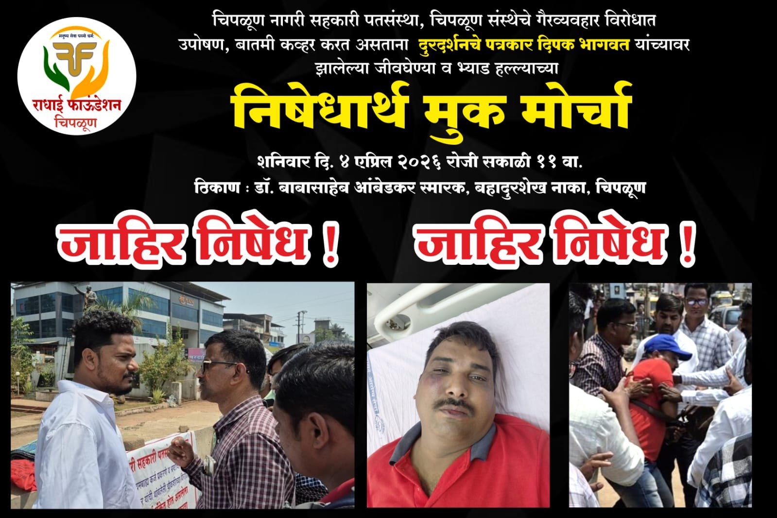 चिपळूण तालुक्यातील पत्रकार दिपक भागवत यांच्यावर झालेल्या भ्याड हल्ल्याच्या निषेधार्थ आणि संबंधित आरोपींना अद्याप अटक न झाल्याच्या पार्श्वभूमीवर संतापाची लाट उसळली आहे. या घटनेच्या निषेधार्थ ‘राधा ही फाउंडेशन’तर्फे उद्या मूक मोर्चाचे आयोजन करण्यात आले असून, या मोर्चाद्वारे निषेध नोंदविण्यात येणार आहे.